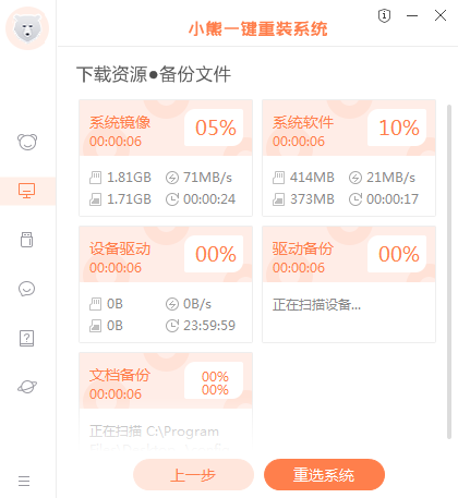 6、小熊開始進行系統鏡像,系統軟件,設備驅動,驅動備份的下載。同時,若想換一個系統下載,可以點擊重選系統,進行取消更換。在這里下載的系統文件較大,請大家耐心等待。