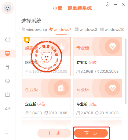 3、在系統選擇界面,可以看到有windows xp windows7 windows8 windows10各種版本的選項,這里以windows7為例,在選項中有各版本的系統給用戶選擇,在這里選擇安裝旗艦版 64位系統,然后點擊下一步。