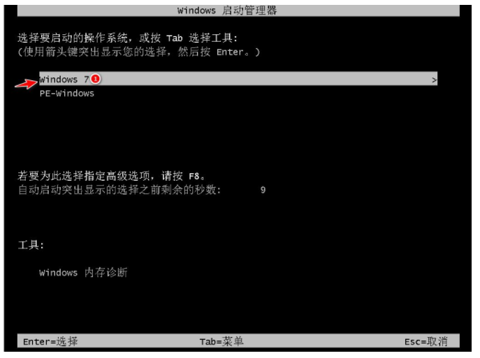 8、重啟電腦后在啟動菜單的界面當中,我們選擇windows7系統按回車鍵進入win7系統即可。