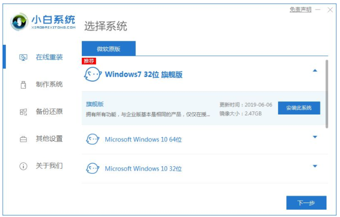 1、首先需要我們在電腦上下載安裝小白軟件,選擇我們需要安裝的win7系統,點擊安裝此系統,點擊下一步。