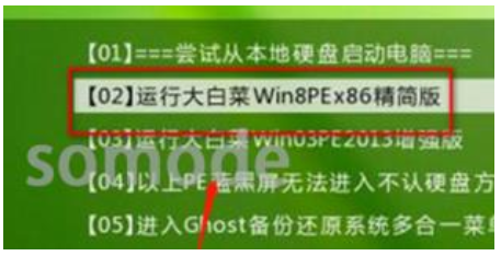 4、此時會進入啟動引導界面,選擇“02運行大白菜win8pex86精簡版”,即可進入。