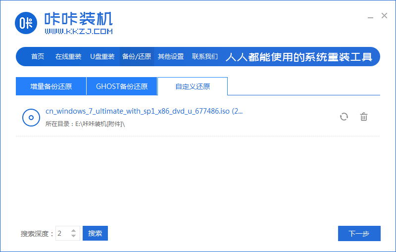 2、選擇“自定義還原”選項,然后選擇需要安裝的win精簡版系統鏡像,點擊下一步。