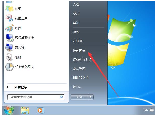 4、進入桌面后,點擊左下角的開始才當,點擊“控制面板”。
