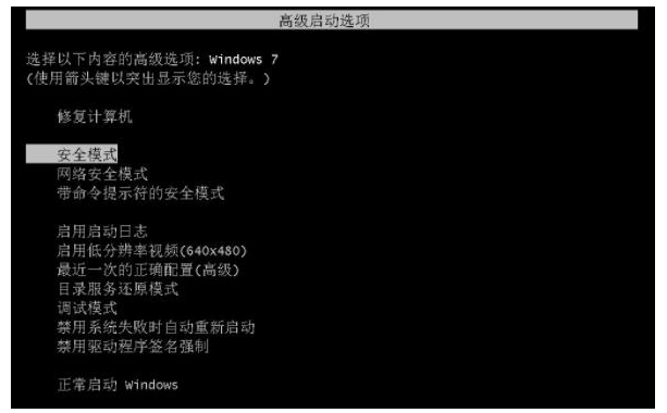 1、win7系統還原失敗解決方法,首先打開電腦,出現啟動界面后按下F8鍵,點擊進入安全模式。