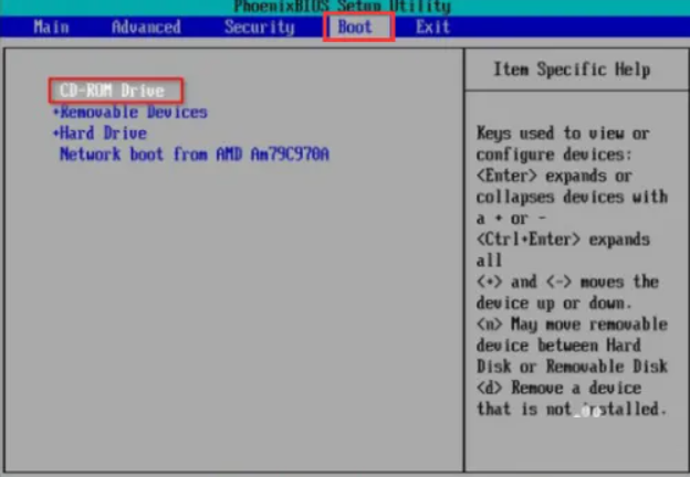 3、點擊"boot",選擇“CD-ROM Drive”。