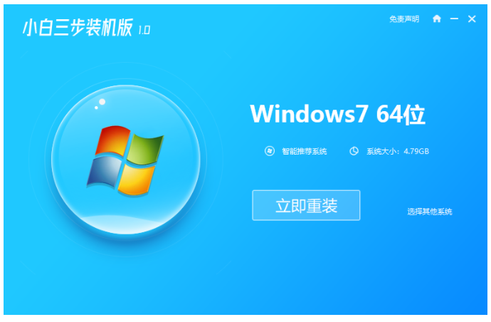 1、我們首先下載安裝小白三步裝機版工具并打開,電腦插入U盤到電腦,然后選擇win7系統,點擊立即重裝。