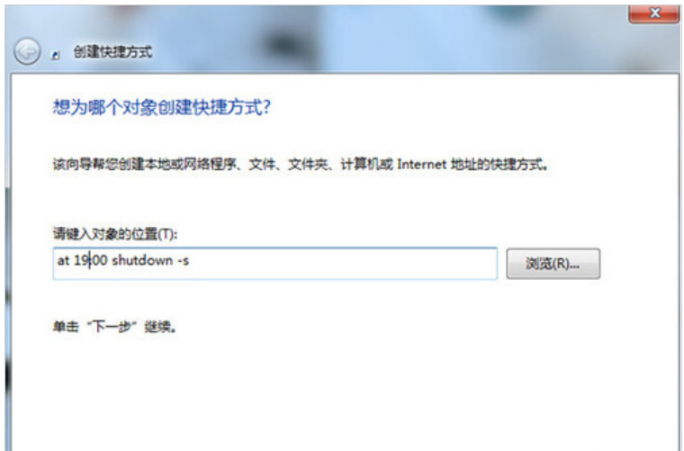 3、在這個界面里輸入:【at 19:00 shutdown -s】在對像位置,里面的19:00就是19點關閉電腦。以后也是到這個時間也會自動關機的。大家可以根據自己的實際情況進行選擇。