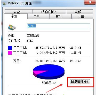 2.在彈出的磁盤屬性界面,點擊磁盤清理按鈕,進入下一步。