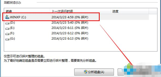 5.在出現的“磁盤碎片整理程序”界面中選擇c盤,然后點擊“磁盤碎片整理”,進入下一步。
