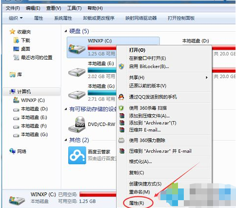 1.打開計算機,鼠標右鍵c盤,選擇屬性打開。