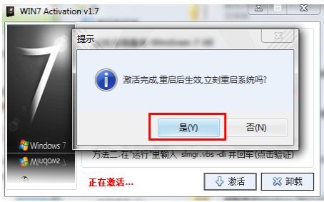 4、稍等一段時間后會激活成功,這時提示需要重啟才能生效。所以要電腦重啟。