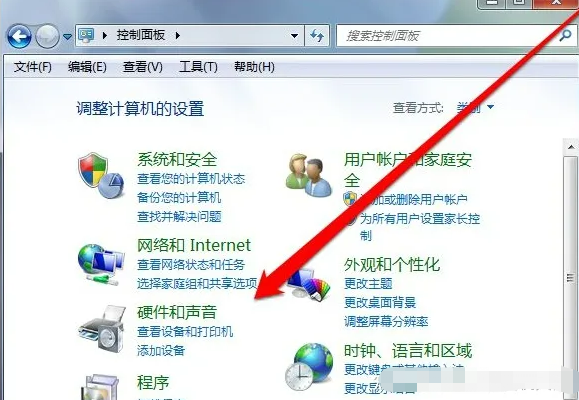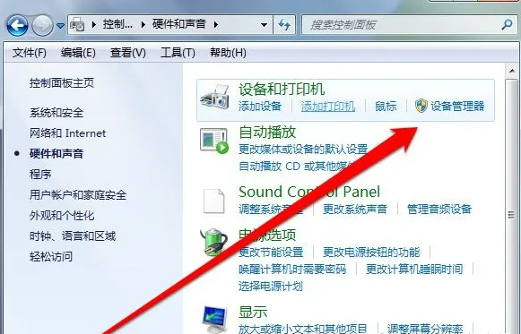2、在控制面板中,點擊硬件聲音,選擇設備管理器。
