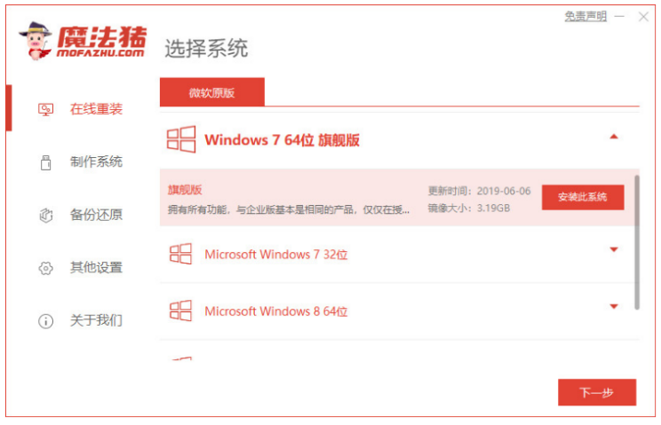 1、首先下載安裝魔法豬工具并打開,選擇在線重裝系統,選擇需要安裝的win7系統,點擊下一步。