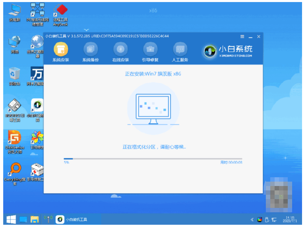 5、進入pe系統后,小白裝機工具會自動開始安裝win7系統。
