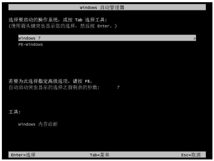 8、我們重啟電腦后在啟動菜單界面當中選擇windows7系統按回車鍵進入win7系統。