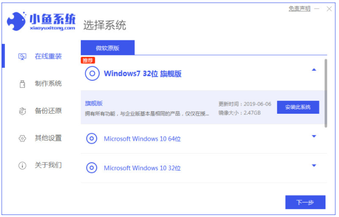 1、首先在電腦上搜索并下載安裝小魚一鍵重裝系統打開軟件,選擇windows7系統,點擊下一步。
