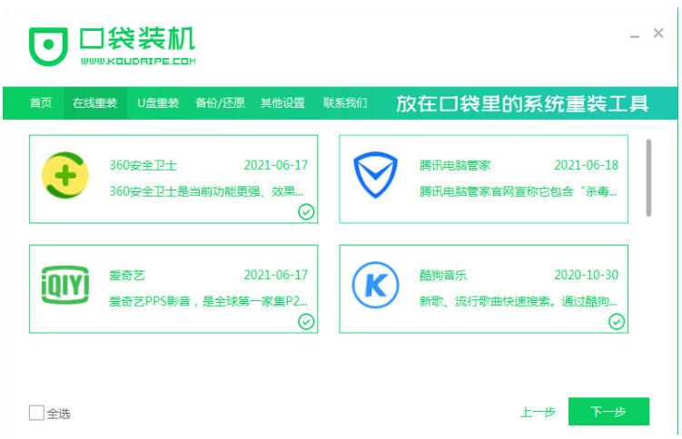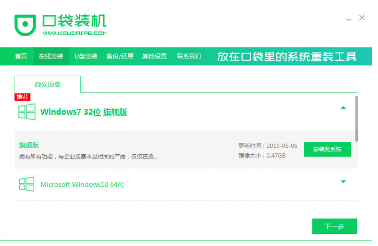 1、首先打開口袋裝機軟件,點擊在線重裝系統,選擇系統,點擊下一步。