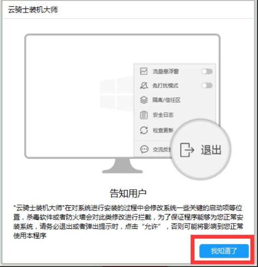 5、提示我們關閉一切殺毒軟件來進行下面操作,點擊下面“我知道”按鈕。