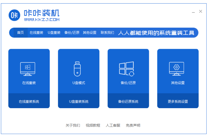 1、電腦如何重裝win7系統呢?首先在電腦上下載安裝咔咔裝機軟件,打開運行,點擊在線重裝。