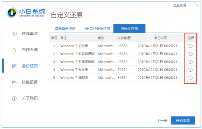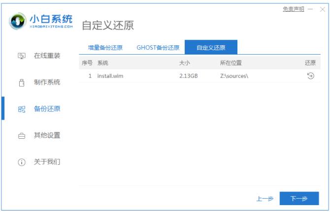 1、首先打開下載安裝好的小白一鍵重裝系統軟件,選擇[備份還原]中的自定義還原。