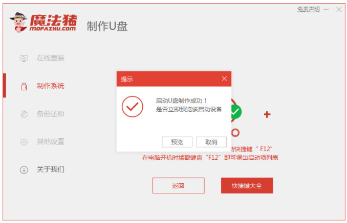 3、提示“啟動u盤制作成功”之后,快速預覽查看需要安裝的電腦主板的啟動熱鍵,再拔掉u盤退出。