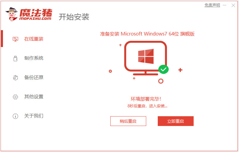 4、在下載好之后進行環境部署,環境部署好之后,點擊立即重啟電腦。