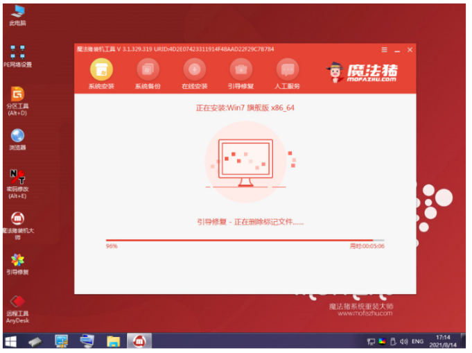 5、來到pe系統之后,魔法豬裝機工具這時將會自動開始安裝win7系統。