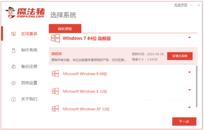 1、電腦win7重裝系統如何操作呢?首先下載安裝魔法豬一鍵重裝系統軟件并打開,選擇win7系統進行安裝。