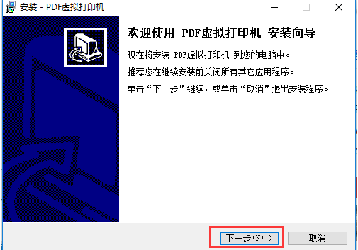 1、首先自行在網上查找并下載PDF虛擬打印機軟件包,解壓后運行exe文件,進入安裝向導界面,點擊下一步。