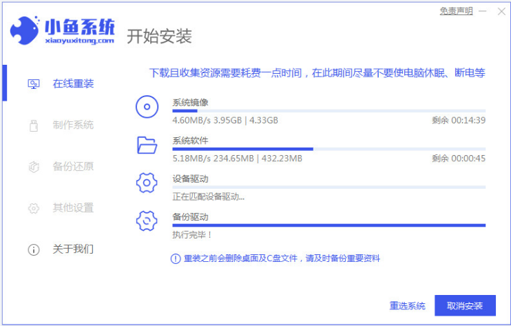 6、耐心等待小魚裝機軟件此時開始自動安裝win7系統即可。