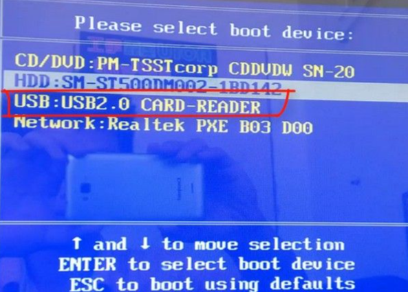 4、把u盤插入要裝系統的電腦上,開機按熱鍵進入啟動項界面,可以選擇USB項,按回車鍵。