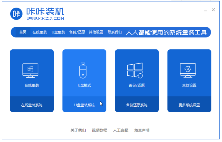 1、我們首先下載安裝咔咔裝機軟件并打開,然后選擇U盤重裝系統。