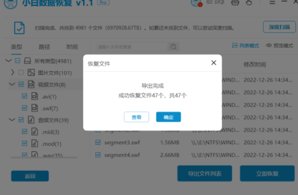 3、耐心等待數據掃描完成后,選擇需要恢復的文件類型,點擊立即恢復,等待軟件對這些數據進行恢復。
