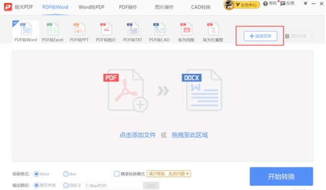 2、來到【極光PDF轉換器】PDF轉word頁面,點擊【添加文件】,把PDF導出來。