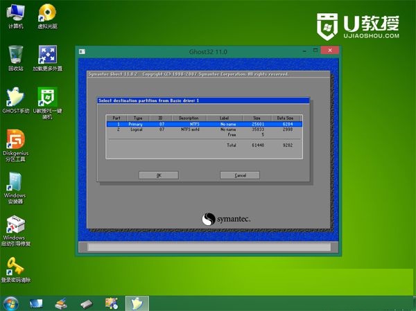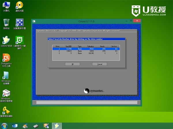 10、我們選擇要安裝系統的硬盤,注意這邊是顯示整塊的硬盤,根據容量判斷,比如小編是60G的硬盤,選擇61440的這個盤,點擊ok;