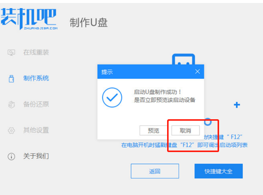 3、在裝機軟件寫入U盤過程中,U盤制作成功之后,點擊取消。