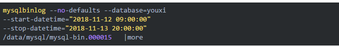 例子2:查詢2018-11-12 09:00:00到2018-11-13 20:00:00 數據庫為 youxi 的操作日志,并輸出到屏幕上。
