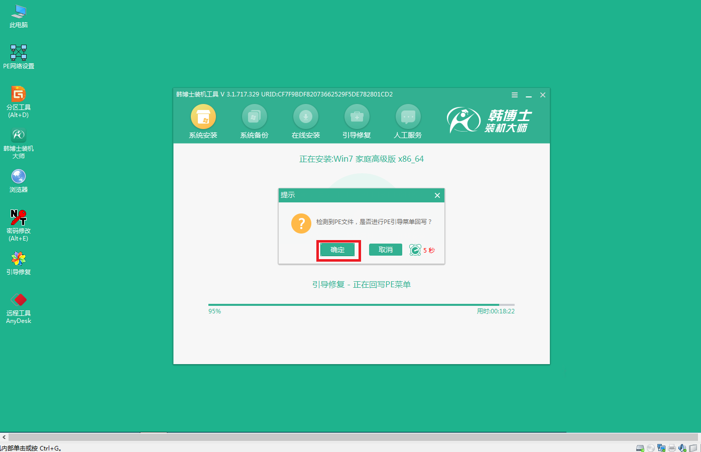 6.韓博士開始安裝系統,彈出“檢測到PE文件,是否進行PE引導菜單回寫”,勾選“確定”。