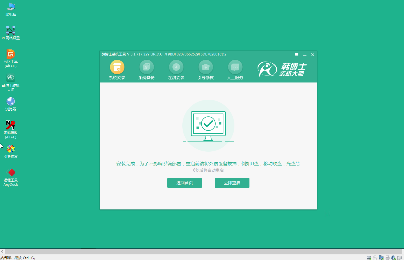 7.韓博士將進入系統部署,再次自動重啟。(ps:此前若忘記備份,此時可點擊“恢復本地備份驅動”,即可找回之前丟失的文件。)