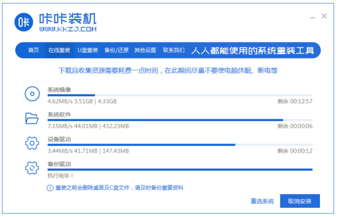 6、在進入pe系統之后,電腦咔咔裝機工具會開始自動開啟并安裝win7系統,我們無需其余操作。