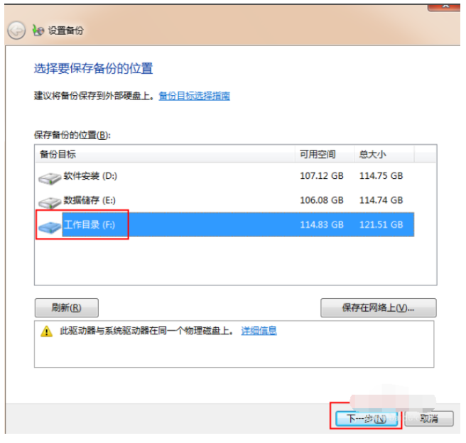 4、將備份保存任意磁盤,然后點擊-下一步。