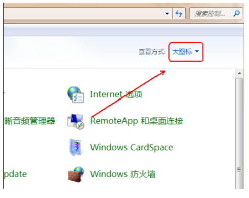 2,我們在“控制面板”文件夾內將“查看方式”更改為“大圖標”選項即可。