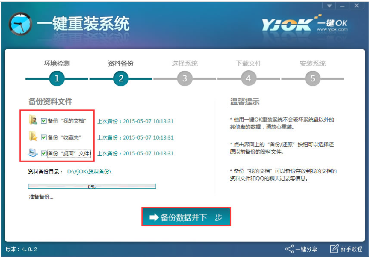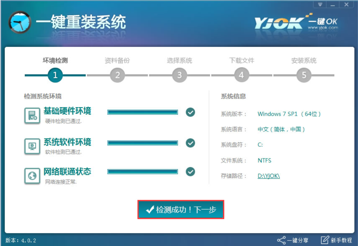 1、首先下載安裝一鍵ok重裝系統軟件,安裝完成后,點擊一鍵重裝系統,等待軟件完成測試。