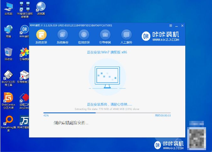 電腦進入PE系統后,咔咔裝機工具會自動開啟并安裝win7系統,無需手動干涉。