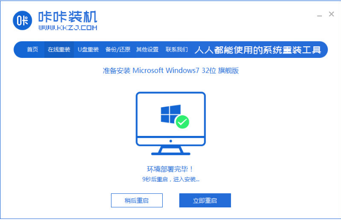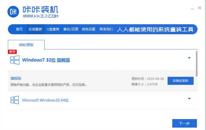 打開咔咔裝機軟件后,選擇在線重裝欄目,點擊需要安裝的win7系統進行安裝了。