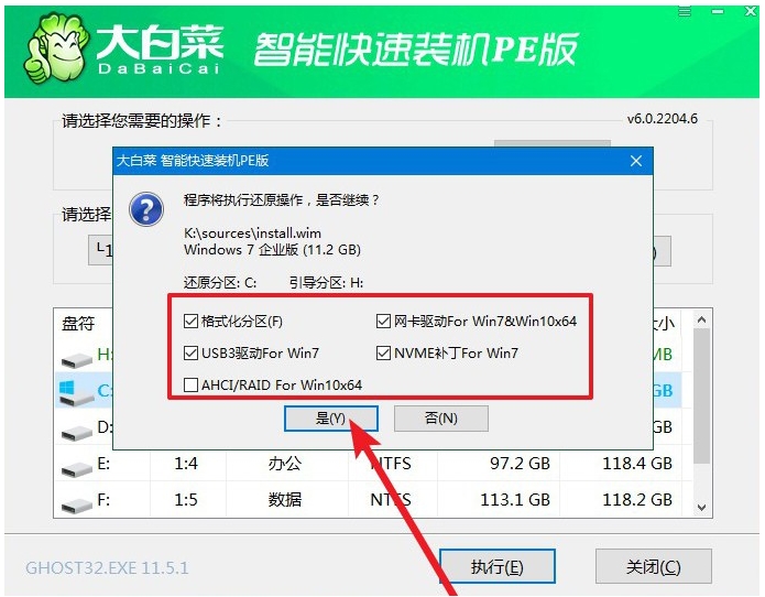 6、 雙擊打開大白菜一鍵重裝軟件,選擇win7鏡像系統作為“鏡像文件”,在安裝在“C盤”中,可以點擊“執行”。