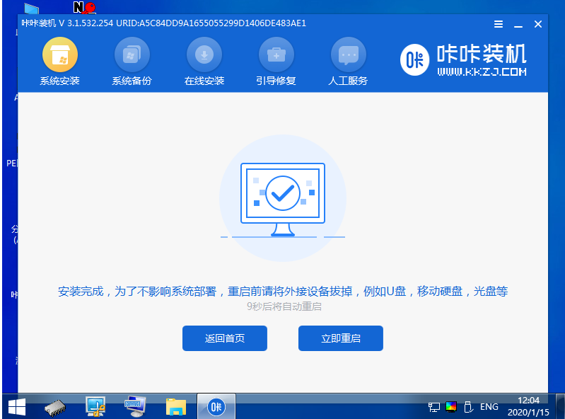 4、在pe系統內,咔咔裝機工具會自動安裝系統,完成后重啟電腦。
