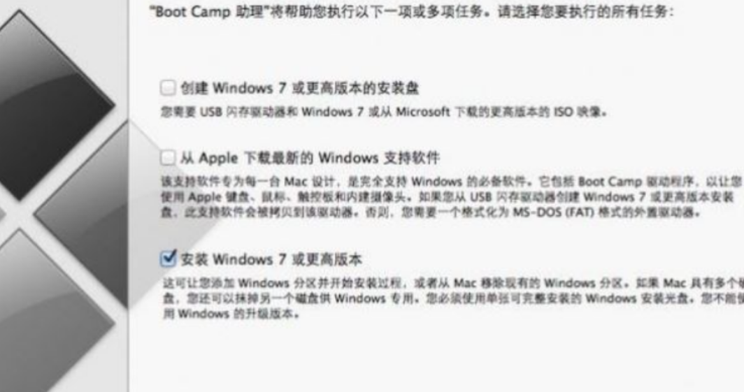5、然后我們把安裝盤插入蘋果筆記本電腦光驅中,再次啟動BootCamp助理,選擇安裝Windows7或更高版本,點擊繼續。