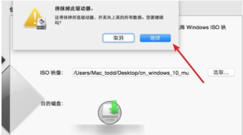 4、在彈出的選項框中點擊繼續即可,進入到鏡像刻錄到U盤環節。