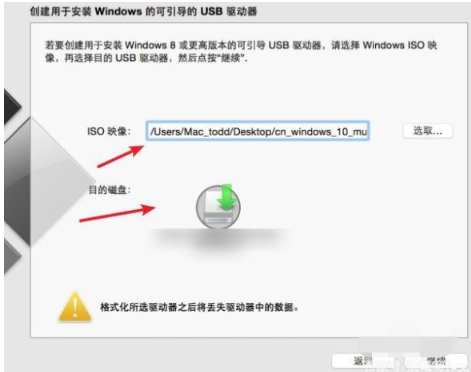 2、我們打開Boot Camp助手選取win10鏡像到U盤中制作U盤啟動盤。